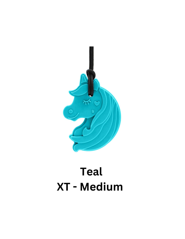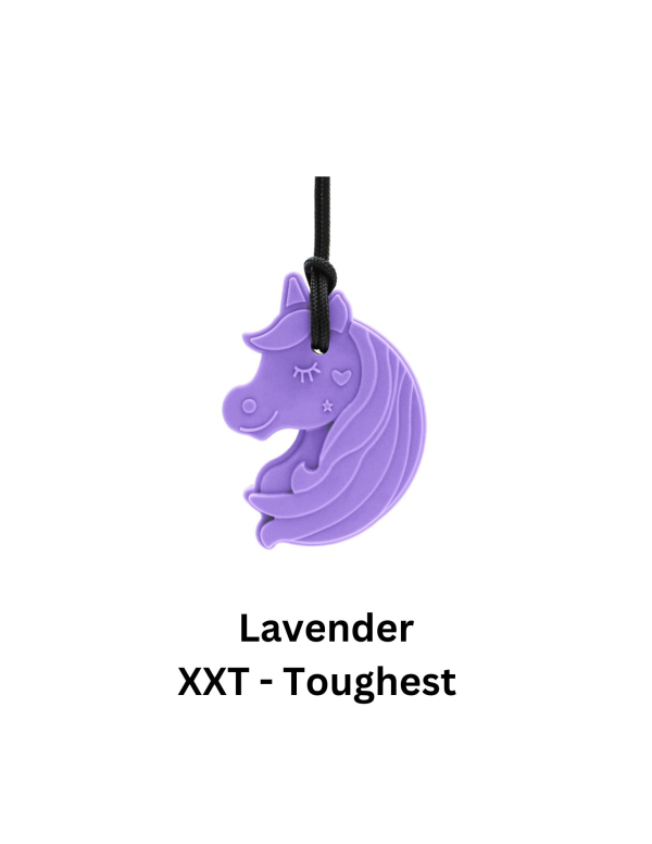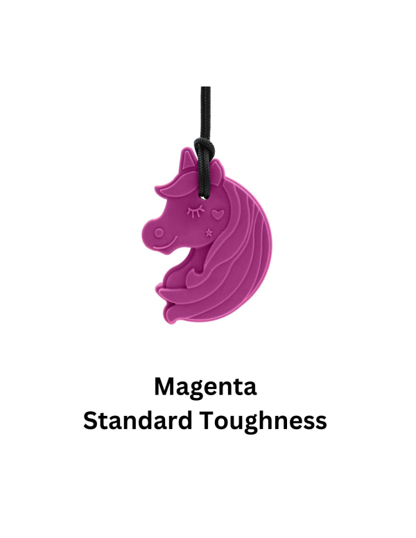 Straight out of fairy tales - a chewable unicorn necklace! ARK's Chewnicorn™ has a beautiful double-sided unicorn design, complete with a sweet heart and star on the face, flowing hair, and the quintessential unicorn horn. According to mythology, unicorns are said to have magical healing properties. In a similar way, many people find chewing to be effective way to calm, self-regulate, and manage stress and anxiety. Use the Chewnicorn chewable necklace as a safe alternative to chewing on shirt sleeves, collars, pencils, fingers, nails, etc. to help calm, focus, and self-regulate. Measuring about 1.7" wide, 2.3" tall, and .5" thick, these unicorns are perfect for those who prefer chewing with their pre-molars and/or front teeth.