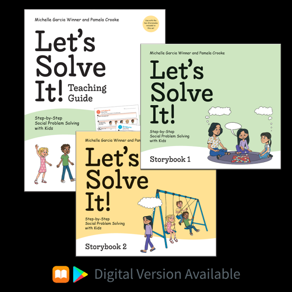 Let’s Solve It! Step-by-Step Social Problem Solving with Kids, 3-book Teaching Set, gives educators, therapists, parents, and caregivers a structured, visual, step-by-step way to teach kids about social problem solving through illustrated stories and problem-solving templates. Two story books help kids explore situations through multiple perspectives, while the companion teaching templates enhance understanding of basic concepts, encourage engagement, and build critical thinking skills.