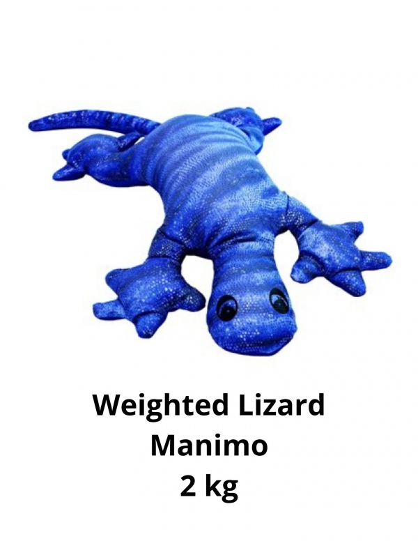 Meet the Weighted Lizard 2 kg Manimo These weighted animals are a sensory tool that benefit all ages. Their benefits include bringing the wearer comfort, helping focus and attention, and calming excess energy. These lovable companions can be used at home during nap time, bedtime, during homework or at work, before or during almost any activity that might be anxiety-inducing or stressful. The animal’s weight helps provide better spatial awareness, calm the nervous system which regulates both behavior and emotions and makes it easier to concentrate or relax. Manimos are soothing and comforting and wonderful to hug. Ages 3 to adult Do not microwave; wash with mild soap.