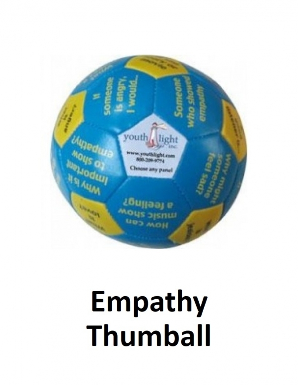 Players respond to prompts on this ball around the topic of empathy. They are encouraged to discuss how to stand in someone else's shoes show good listening and make skillful statements to others as they experience any of several emotions. The Thumball offers a fun way for students to discuss the topic of empathy which affects them personally, socially, and academically. Empathy training should be a fundamental part of any anti-bullying program. When students learn to better understand and appreciate the feelings and perspectives of others they become less likely to be bullies and more willing to reach out to any of their peers who might be bully victims.