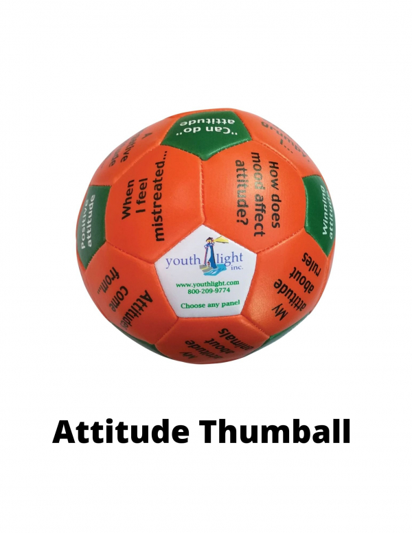 The Attitudes (Mindset) thumball gets at the heart of self-awareness - one's attitude. The question and prompts explore ideas such as what to do if someone "does not get their way"or what does it look like when someone "feels interested". This is a thumball that would be appropriate for intermediate / middle school aged kids right up to adults.