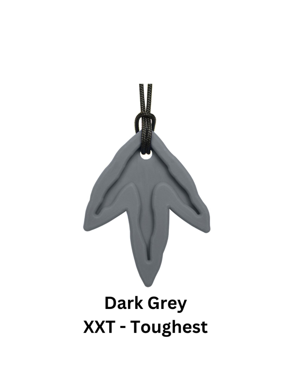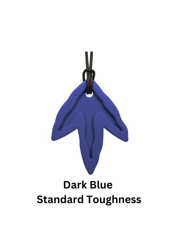 This necklace is sure to be a hit with dinosaur fans. It has a "fossil" imprint on the front side, a smooth back side, with 3 points to chew on. The pendant measures approximately 1.75" wide by 2.25" tall by .4" at the thickest part. Use this oral sensory solution as a safe alternative to chewing on pencils, shirts, fingers, etc. and to help calm, focus, and self-regulate.