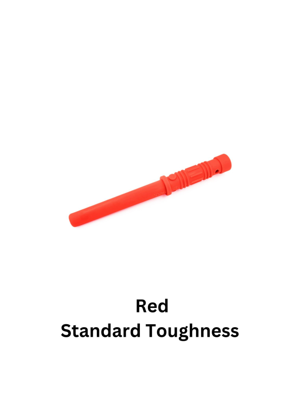 The Mega Bite Saber is a handheld chew that has a hole on one end in case you'd like to add it to a cord. This chew tool is a safe outlet for anyone who needs to chew, and an effective way to help calm, self-regulate, and focus. It's long enough to reach the back molars for proprioceptive input to the jaw and masseter muscle.