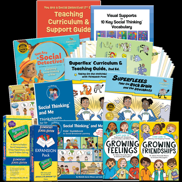 You have to reach kids before you can teach them! This bundle of eight products, includes two fun & kid-friendly Social Thinking® SEL curriculams, a popular social learning card game, and innovative teaching ideas that engage children ages 5-12 in social emotional learning that feels relevant to their lives and taps into activities they love. Use these products to motivate and inspire kids to learn how the social world works so they can work toward meeting their own social and academic goals. This bundle includes:Visual Supports for 10 Key Social Thinking Vocabulary Concepts,You Are a Social Detective! Explaining Social Thinking to Kids, 2nd Edition (Storybook),You Are a Social Detective! Teaching Curriculum & Support Guide,Superflex 2nd Edition Kit: Curriculum, Storybook, and Visuals,Social Thinking and Me (two-book set),Should I? or Shouldn't I? Revised Elementary Edition,Should I? or Shouldn't I? Elementary School Edition Expansion Pack,Growing Friendships: A Kids’ Guide to Making and Keeping Friends,Growing Feelings: A Kids' Guide to Dealing with Emotions about Friends and Other Kids. (Series and sets are not eligible for further discounts.)   NOTE: This item may incur extra shipping costs. Submit Order as Quote at checkout, and staff will contact you to provide you with complete shipping costs for your items.