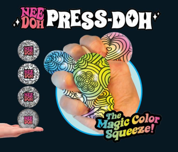 Squish outside the lines with the NeeDoh Press-Doh! Watch as the groovy black and white pattern bursts into a kaleidoscope of colors with each squeeze. The mellow vibes of its classic dough filling provides a chill sensory sensation. Experience the magic color squeeze!